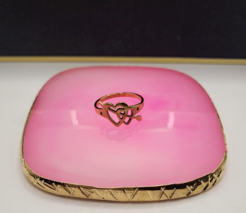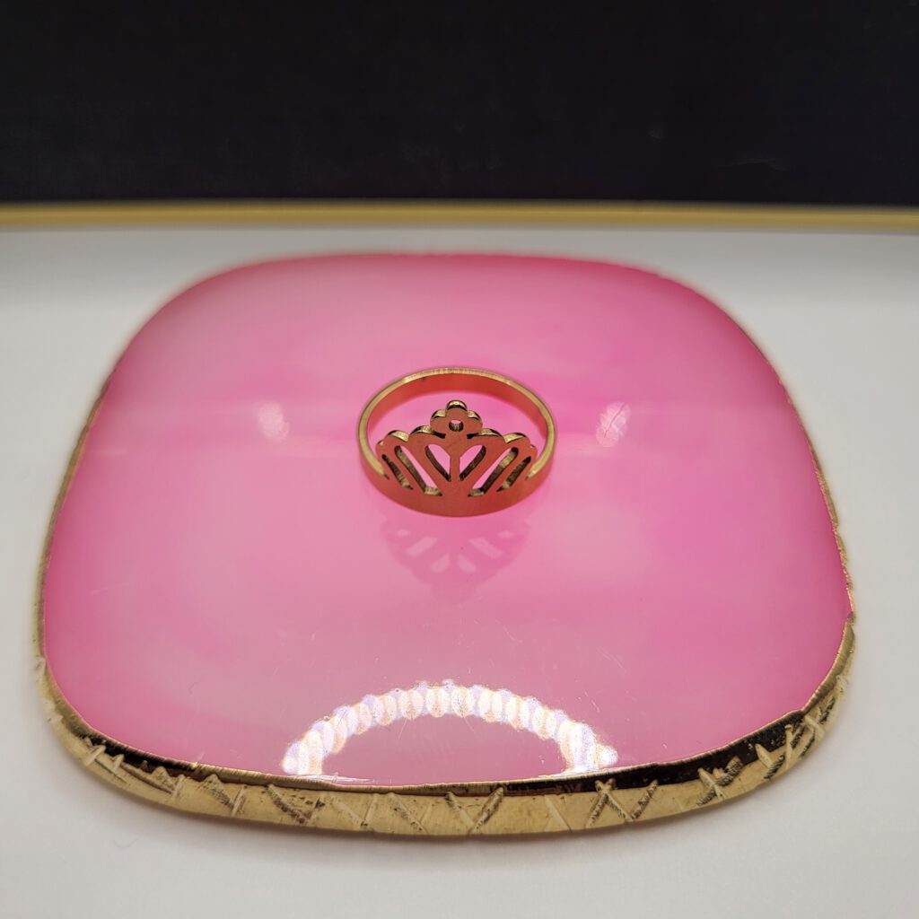 Brede, goudkleurige ring met patroon, gemaakt van stainless steel. De ring is ongeveer 0,3 cm breed.