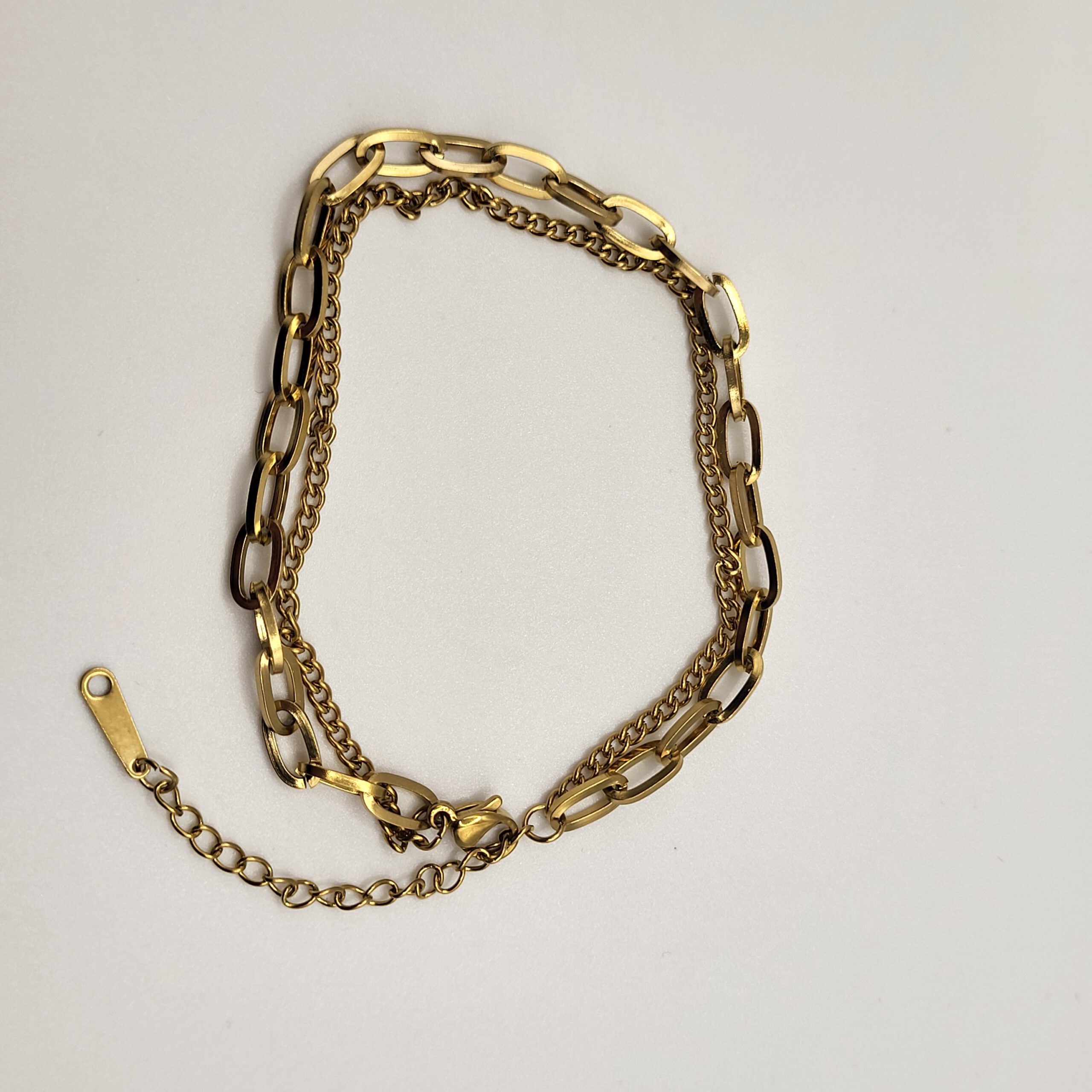 Dubbele, goudkleurige armband, gemaakt van stainless steel. De armband heeft een totale lengte van 22,5 cm en is0,2 cm en 0,4 cm breed.