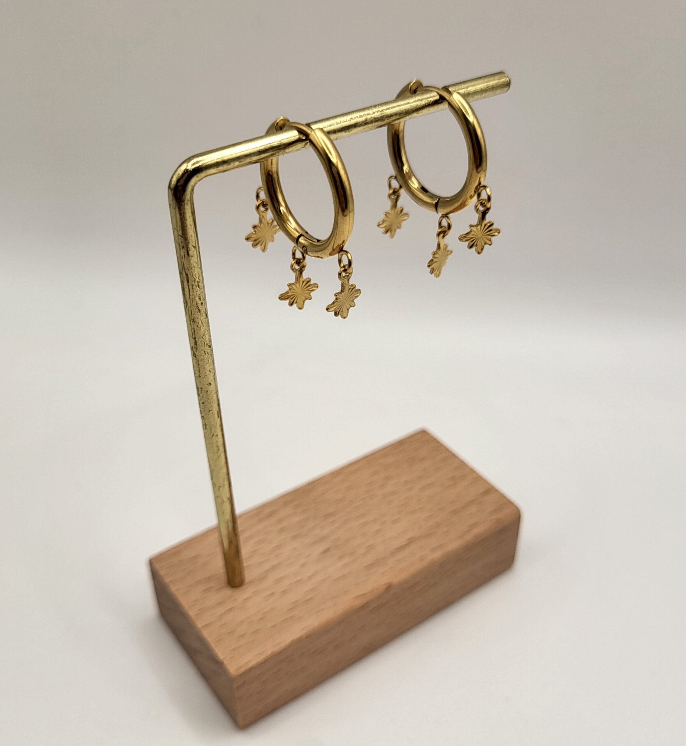 Goudkleurige oorbellen met 3 sterretjes, gemaakt van stainless steel. De diameter van de oorring is 2 cm en de hangertjes zijn ongeveer 0,8 cm x 0,7 cm. *Handmade