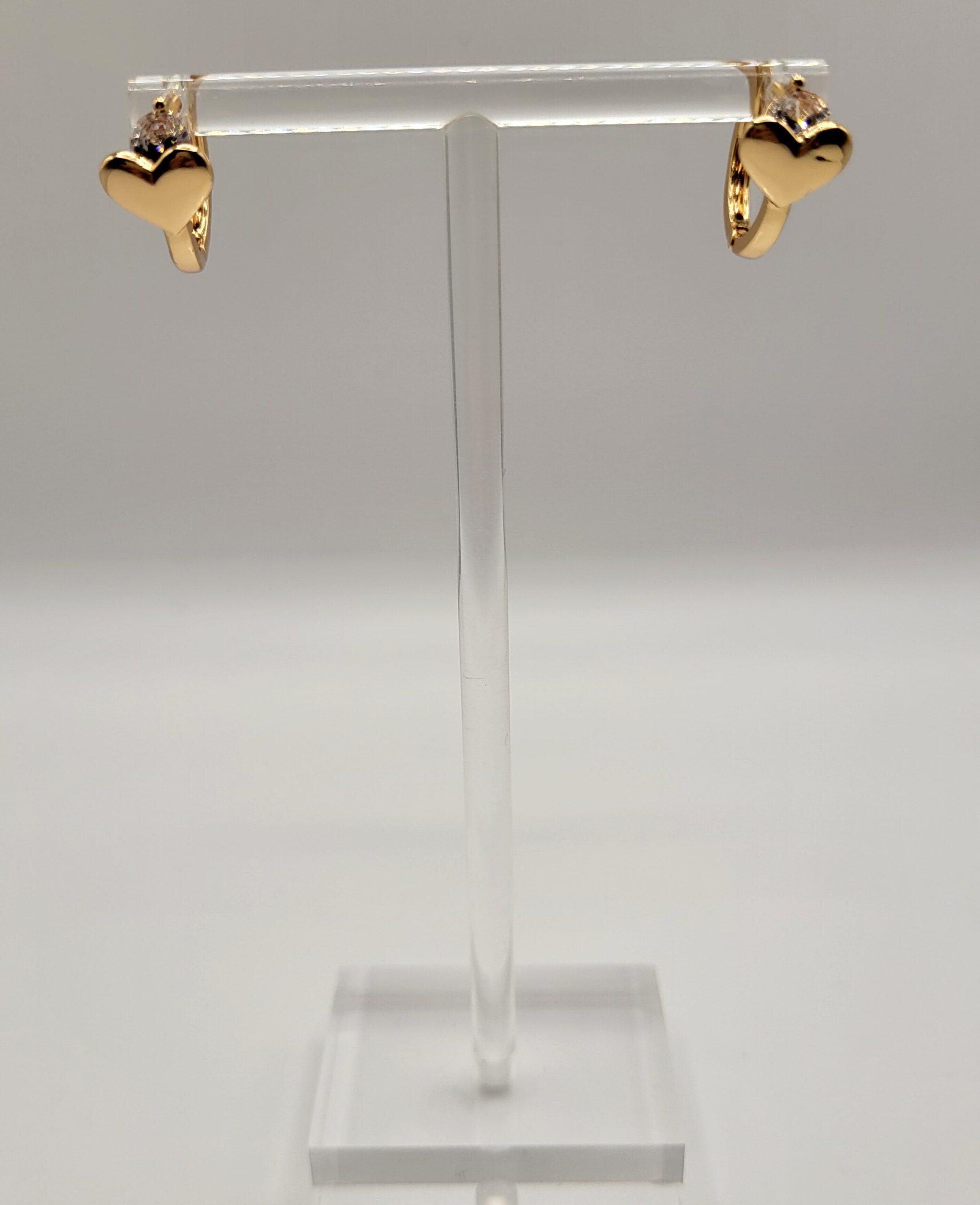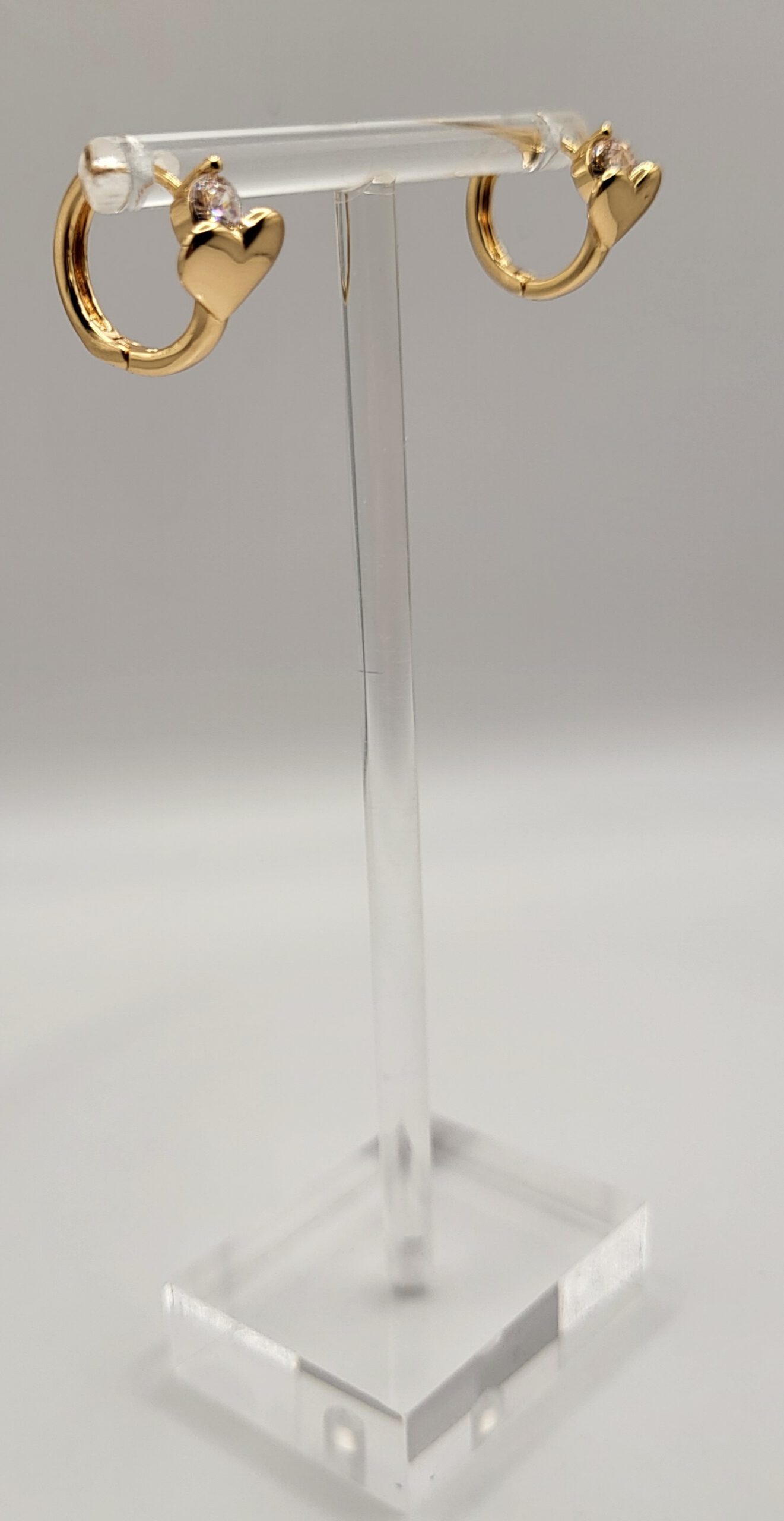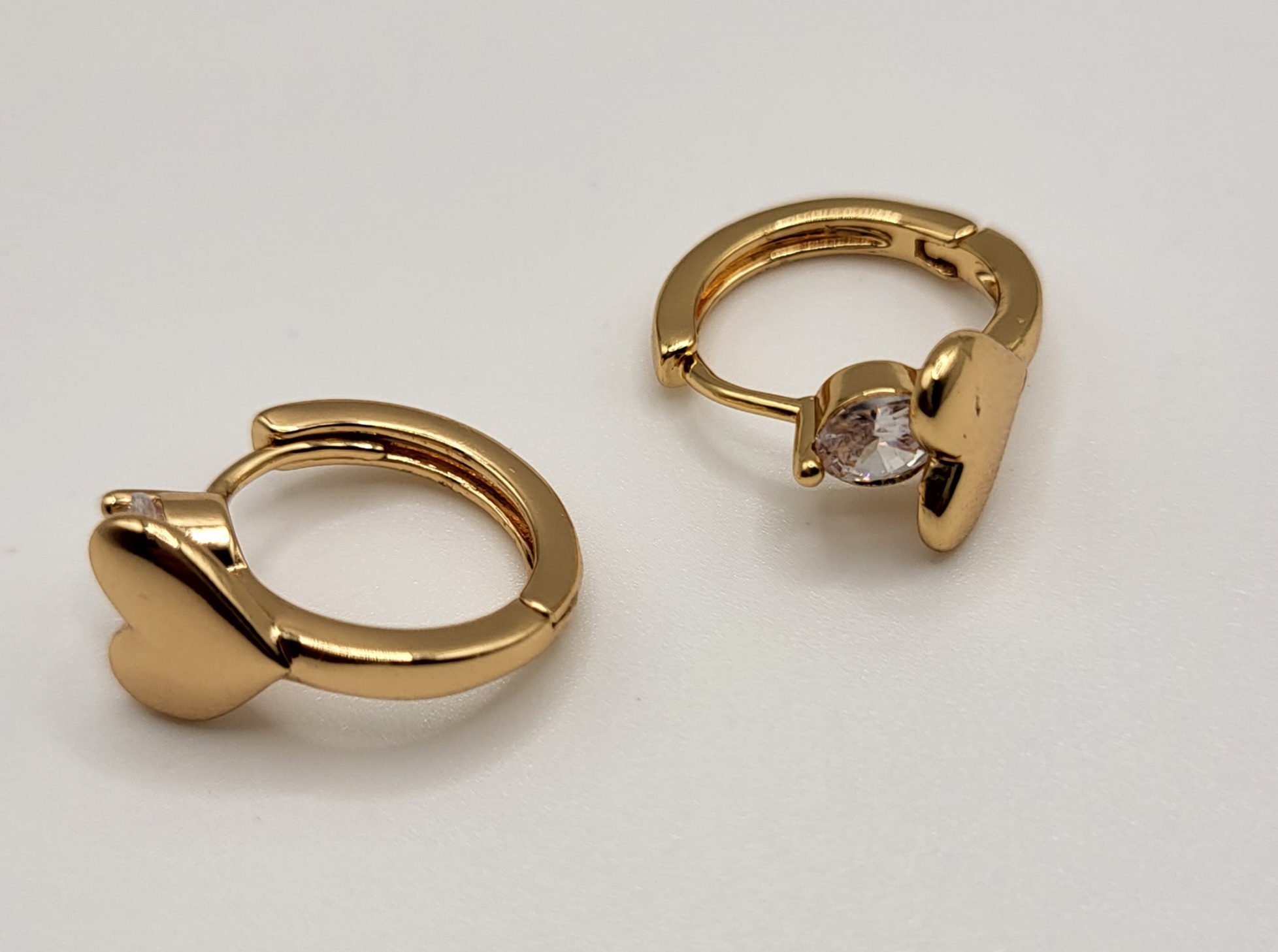 Goudkleurige oorringen met zirkonia steentje en hartje. De oorring heeft een diameter van 1,2 cm.