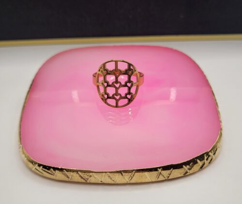 Goudkleurige ring met groot “love”, gemaakt van stainless steel. De ring is ongeveer 0,3 cm breed.