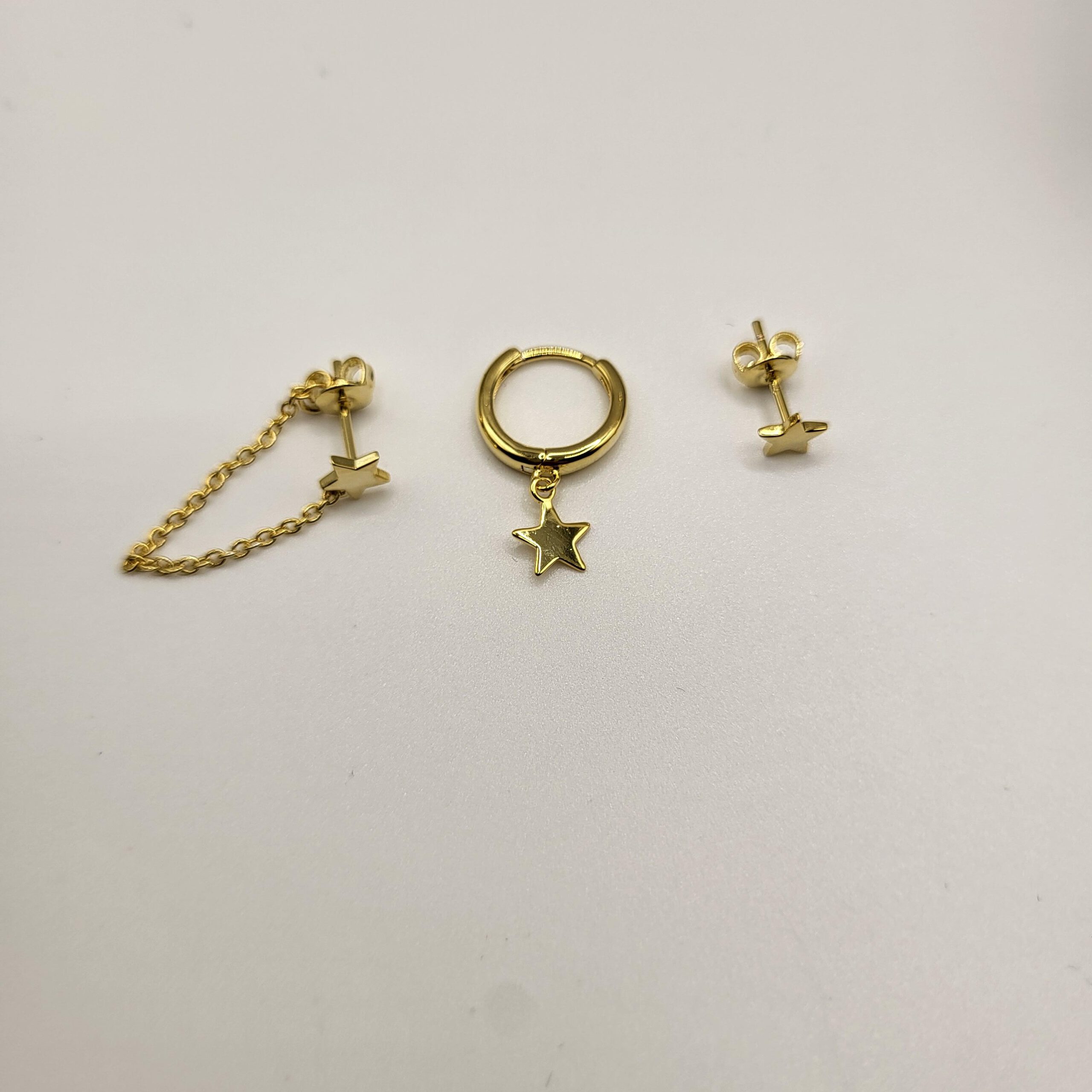 Setje van 3 goudkleurige oorbellen met sterretjes, gemaakt van sterling zilver. Het setje bestaat uit 1 oorring en twee oorknopjes. De oorring heeft een diameter van 1,2 cm en het hangertje is 0,6 cm x 0,6 cm. Het eerste oorknopje is in de vorm van een sterretje met een kettinkje en het tweede oorknopje is een sterretje.