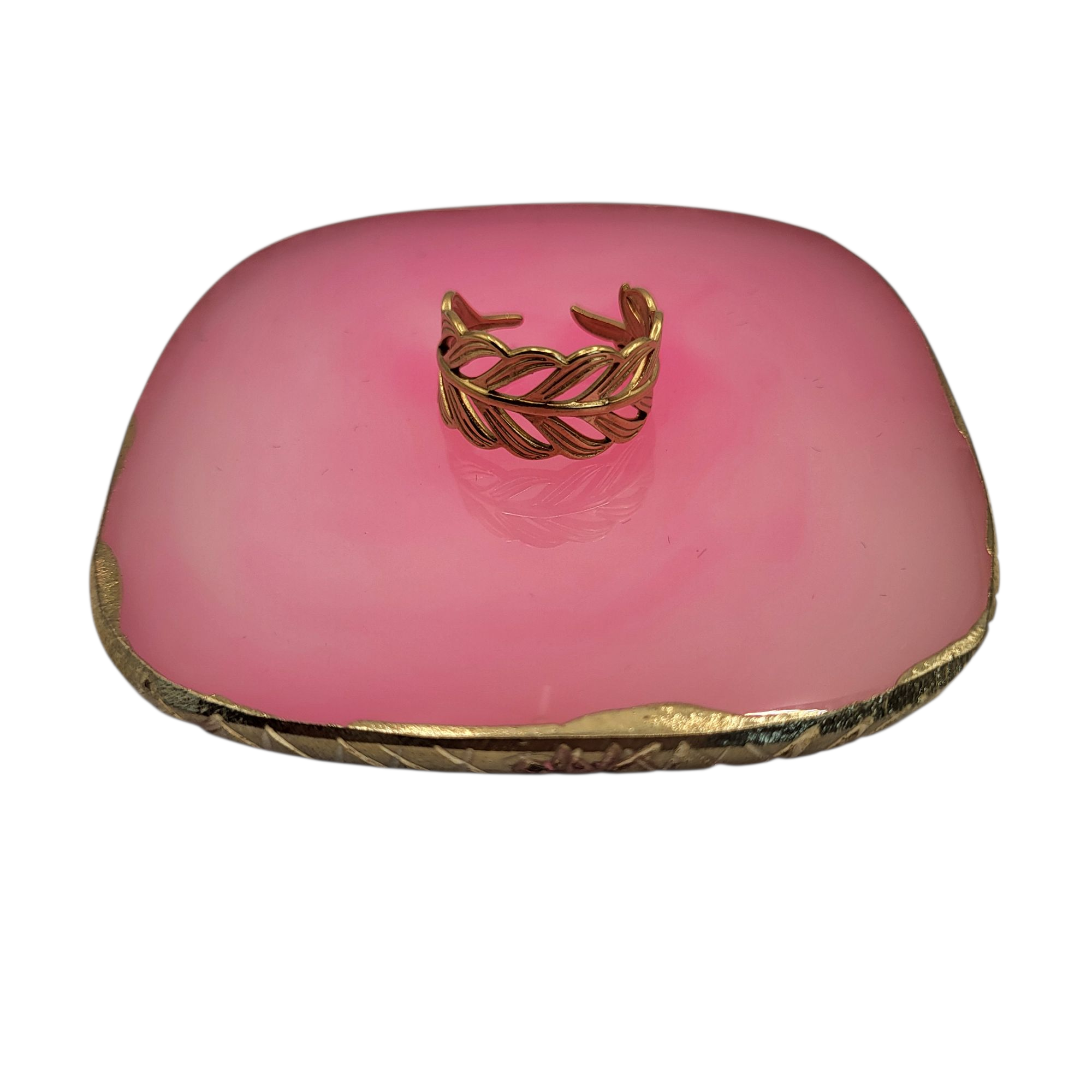 Goudkleurige, verstelbare ring met blaadjes patroon, gemaakt van stainless steel.
