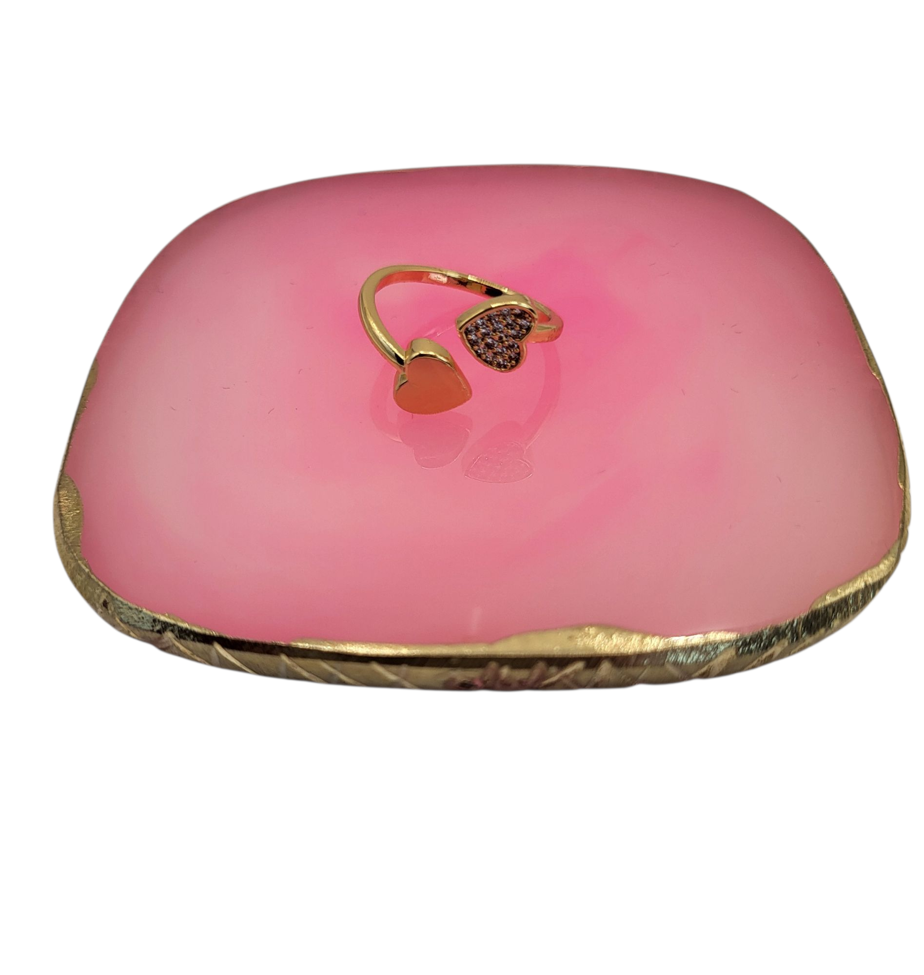 Goudkleurige, verstelbare ring met hartjes en transparante zirkonias, gemaakt van stainless steel.